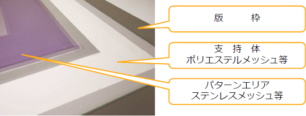 パターン形成部にSUSメッシュを使用し、その外周を異素材で接合するハイブリッドな製版方式「コンビネーション版」。